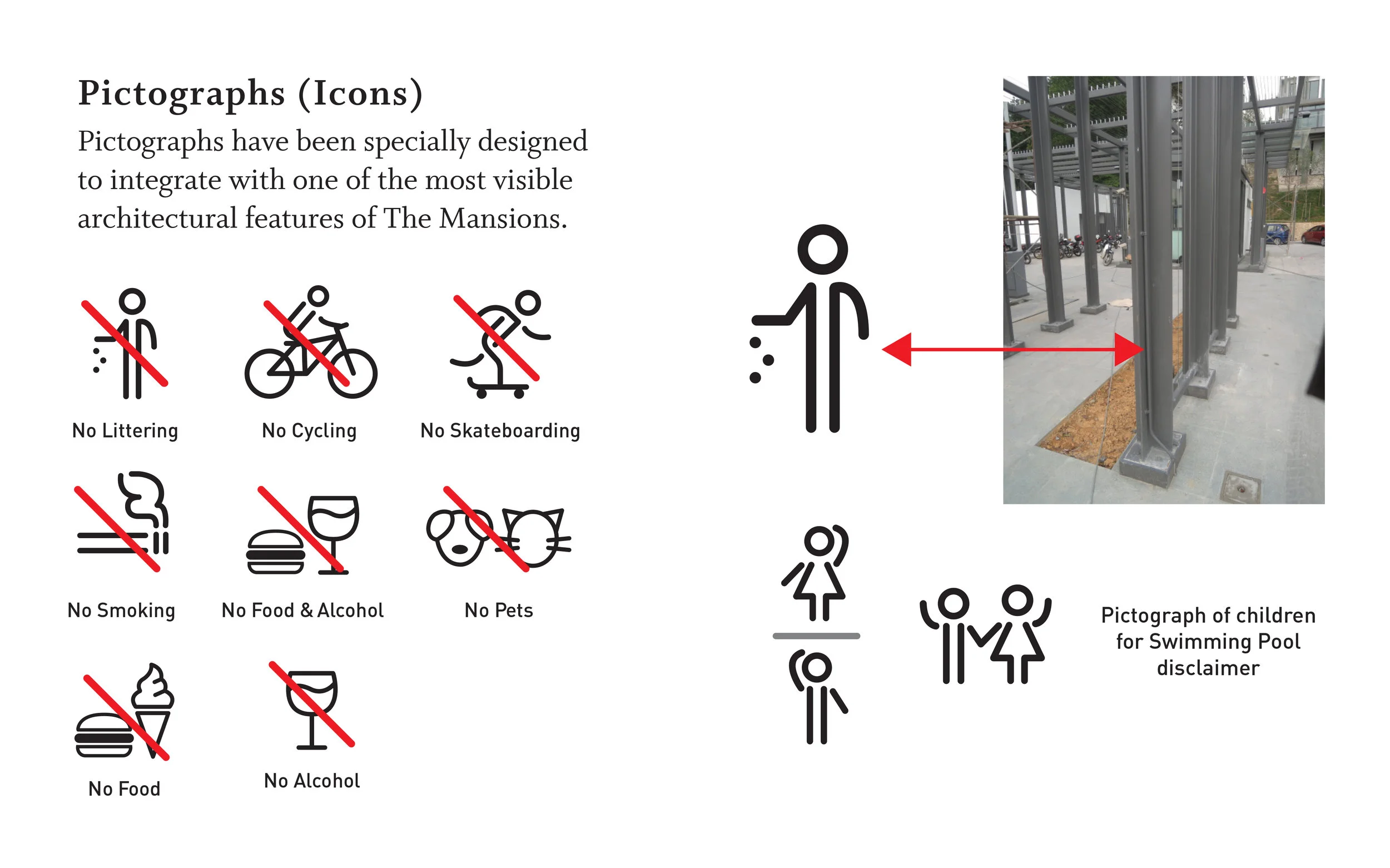 The existing signage proposal prepared for The Mansions was rejected by the client, and we were requested to take over the signage programme for the residence. We also concurrently designed new sign systems for Breezeway and Westside II. We had to address some crucial safety issues as well as reflect the unique character of each development in our sign design.