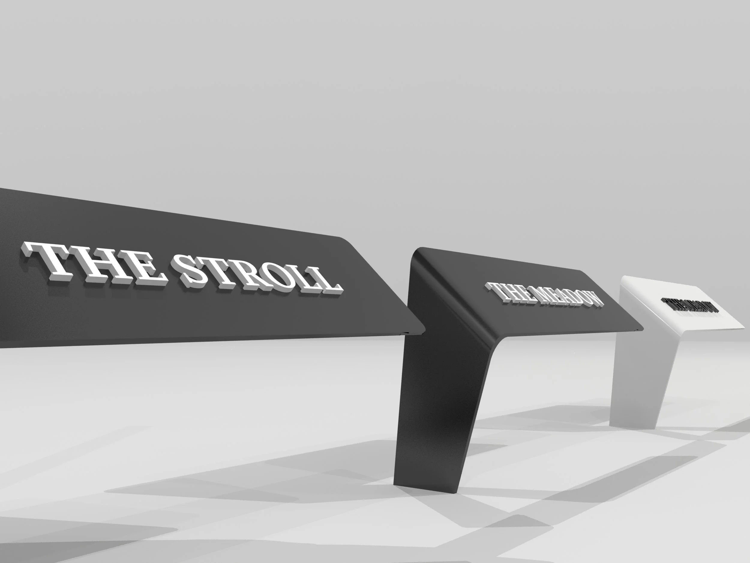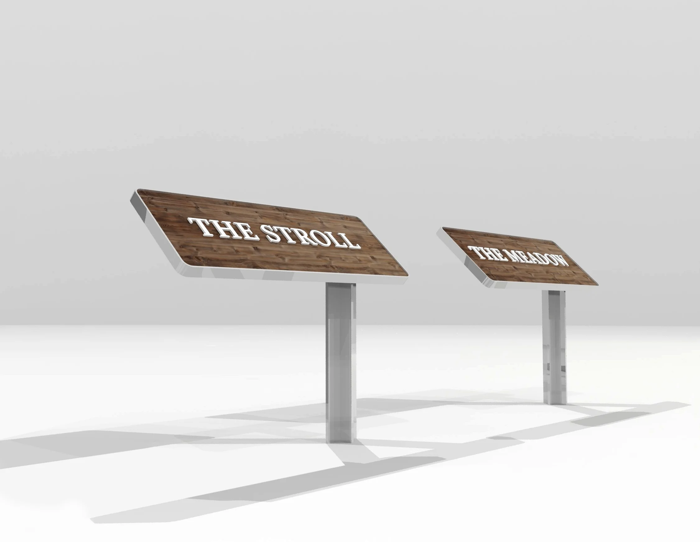In the final design, we adapted the T-beam, used by the architect as a visual statement, for all pole directional signs, which serves to further cement the identity of the development.