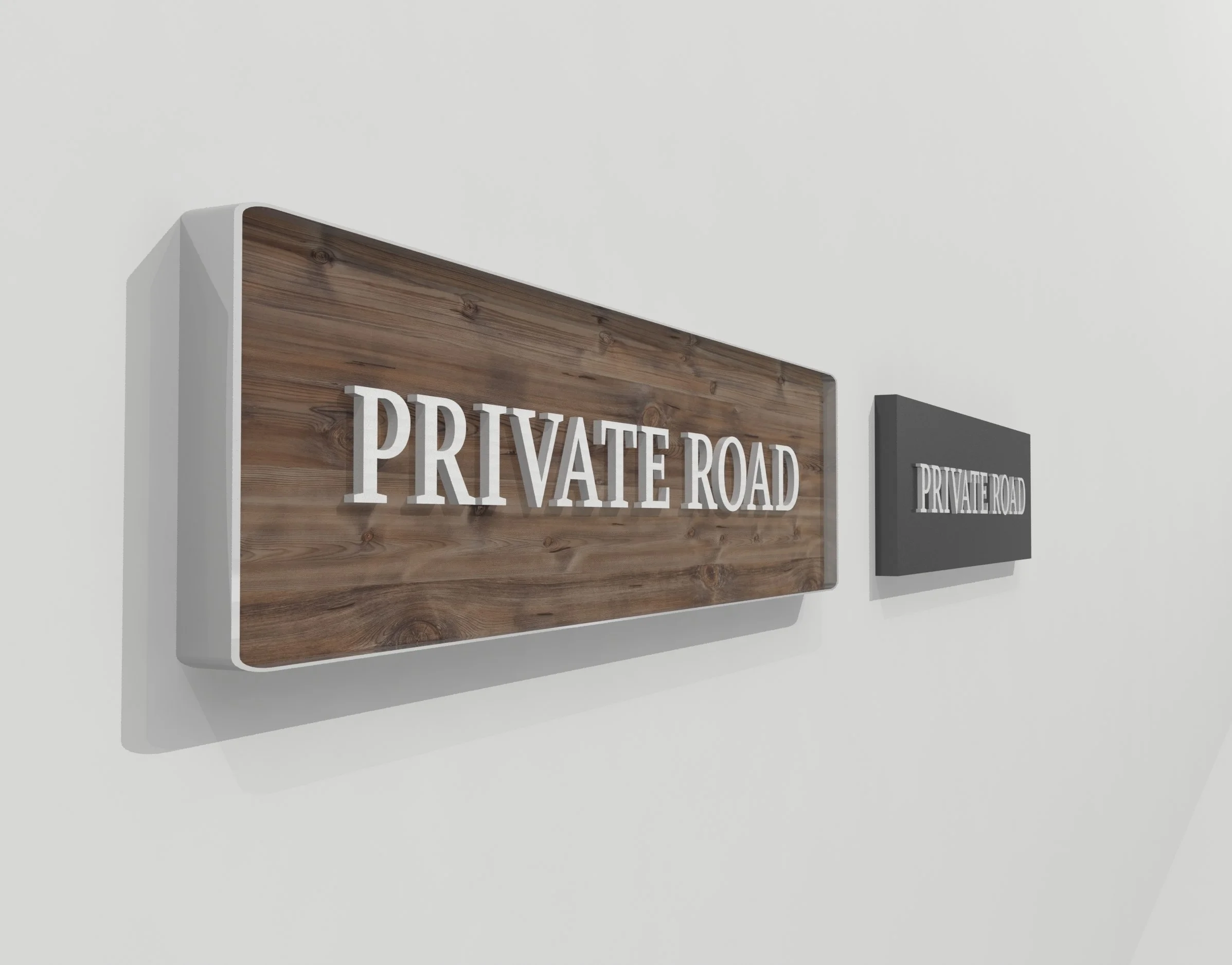We made 3D explorations of two potential sign materials that could properly capture the premium edginess of The Mansions: a wood-based sign framed with mirror-coated stainless steel and a simple aluminium sign spray-painted with neutral grey.