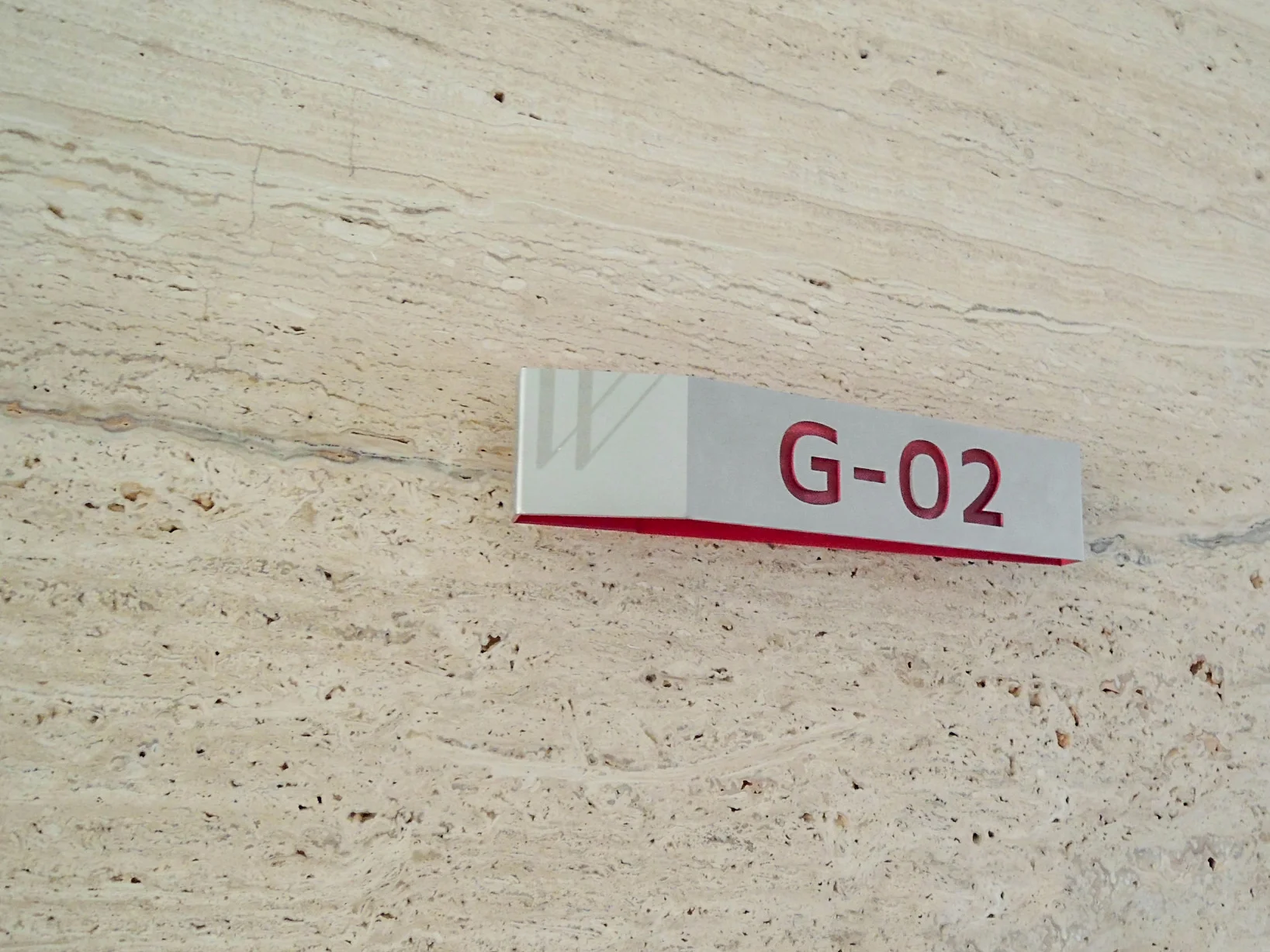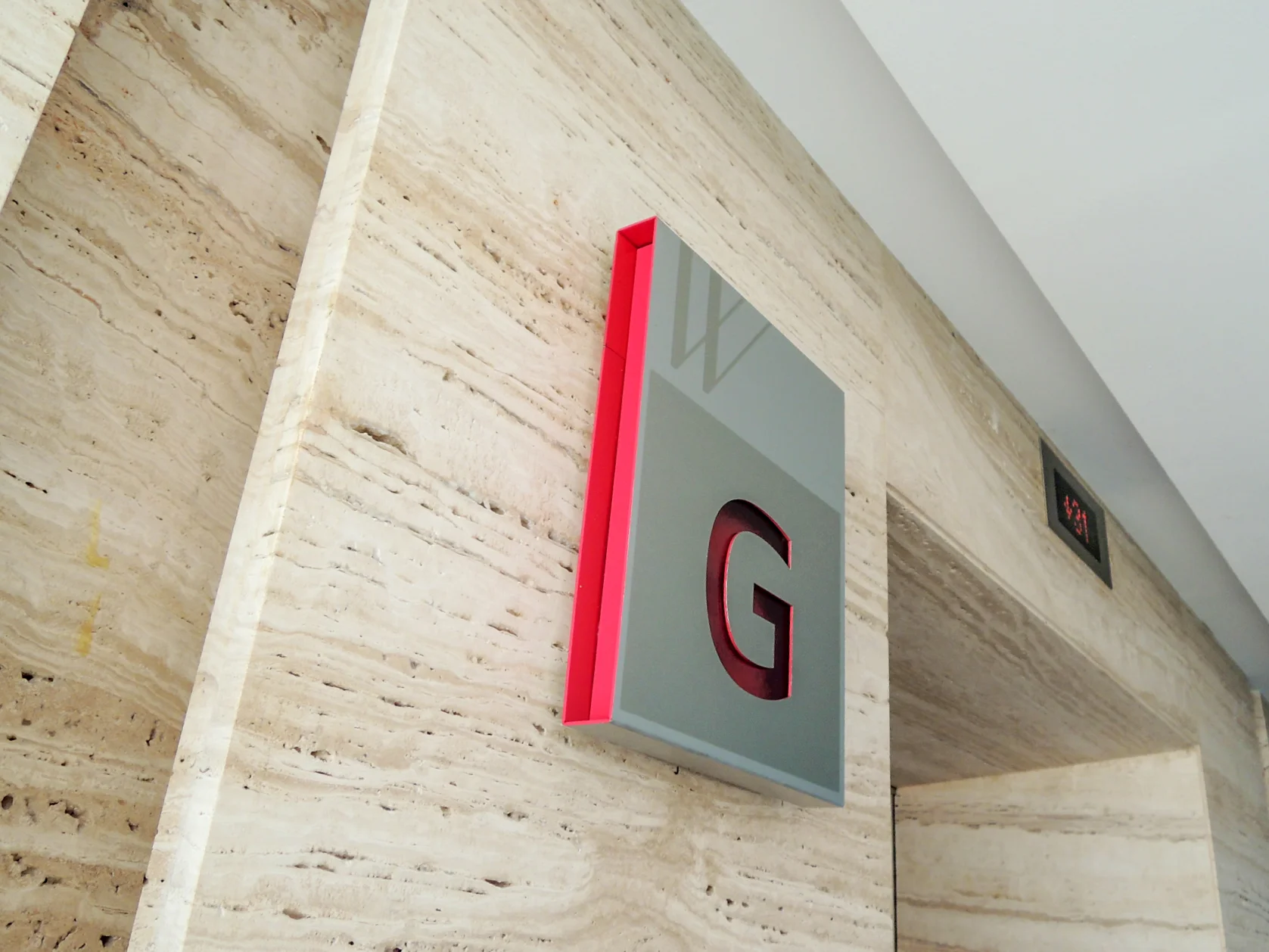 For the interior signs, letters are cut out on the outer layer of these signs to display the accent colours on the inside layer.